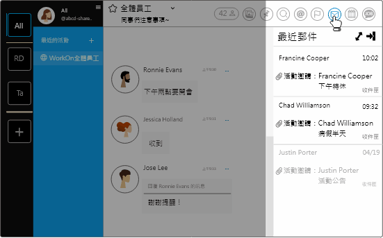 在即時通訊的操作介面上,SideBar 整合了郵件和行事曆,方便即時查看新郵件和行程安排。不需切換分頁或應用軟體,單一介面即能掌握所有資訊,重要訊息一個都不漏。