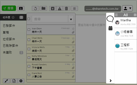 在 SideBar 整合 ChatOn 即時通訊跟 CalOn 行事曆,閱讀郵件的同時,不論是回覆即時訊息或是查看行事曆活動,通通不需要離開 MailOn 介面。