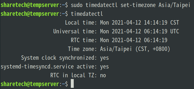 預設時區為 +0,輸入指令sudo timedatectl set-timezone Asia/Taipei修改為台灣時間 (+8),最後再輸入timedatectl確認是否修改成功