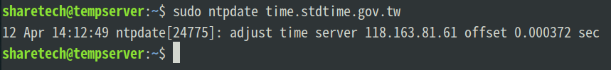 若時間錯誤,可再執行一次 sudo ntpdate time.stdtime.gov.tw 校正時間。