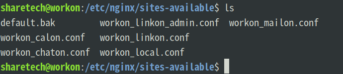 若憑證申請時,各主機為獨立憑證如chaton.workon.com.tw、mailon.workon.com.tw等,則需改變憑證檔名稱或路徑。更改 CA 設定路徑與檔名1. 切換到設定檔目錄/etc/nginx/sites-available2. 更改設定底下有 4 個檔案代表 4 個檔案