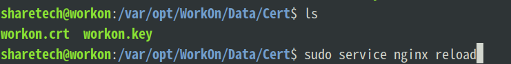 workon.crt 與 workon.key 更改為新的檔名替換檔案上傳新的檔案,檔名與路徑需與上述步驟相同。重新載入設定檔案上傳完成後,輸入指令sudo service nginx reload載入新的設定。