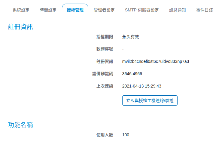 註冊資訊: 先確認是否已連線到授權 server,如果連線成功,會顯示註冊資訊以及設備辨識碼。