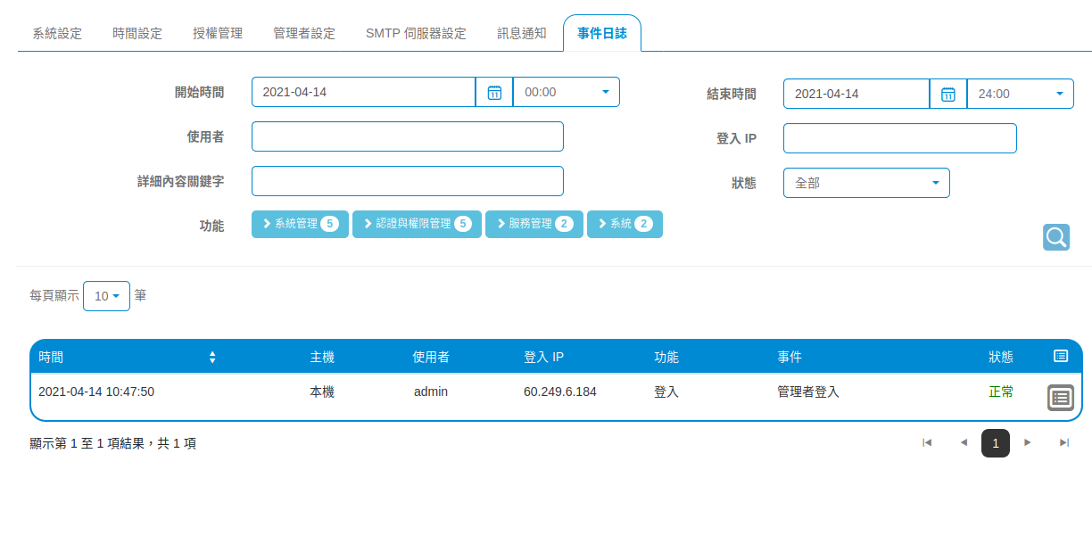 時間設定可以調整主機所使用的時間伺服器,也可以手動校正時間差。時區若有變動,會改變授權管理的連線時間和事件日誌內的紀錄時間。![]()