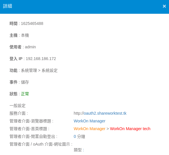 管理者介面-閒置自動登出: 在管理者介面閒置多久會自動登出,預設為 0 分鐘(不自動登出)。