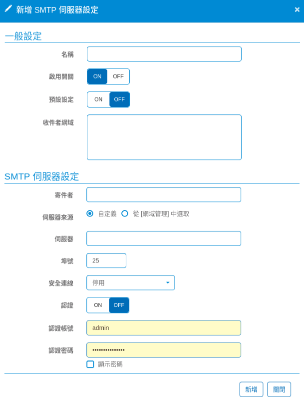 點選右側「+」號來新增 SMTP 伺服器,設定畫面如下:![]()