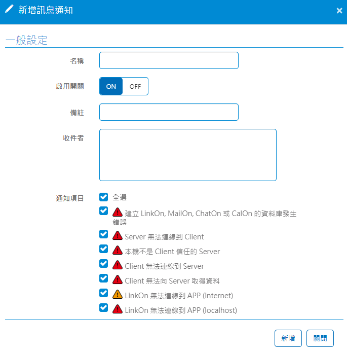 點選表格右側「+」號來新增通知對象及項目,設定畫面如下:![]()