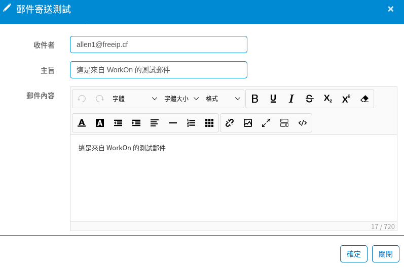 • 寄送系統通知信:WorkOn 本身不是郵件伺服器,因此需要一個具有 SMTP 寄信功能的帳號,透過郵件伺服器來寄出通知信。• 由於 WorkOn 支援多網域,通知信的寄件者也可以依網域分配。例如:屬於 workon.com 網域的通知信,以帳號 1@workon.com 寄出;屬於 workon2.com 網域的通知信,以 2@workon2.com 的帳號寄出。在多網域的情況下,這樣的區分方式可以避免混淆。• 如果只設定一筆,則所有的通知信都會用該筆 SMTP 帳號寄出。