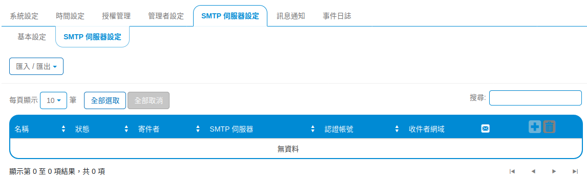 SMTP 伺服器設定可選擇寄送通知信時,要由哪個伺服器寄信及其寄件者。可以針對不同網域設定不同的寄件者,在多網域的情況下也能正確的寄出通知信。在 SMTP 表格中,可選擇每頁顯示幾筆資料,並且選取資料執行動作如郵件寄送測試、編輯