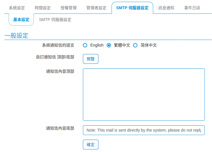 SMTP 基本設定主要為修改信件內容的呈現,讓收到通知信的收件者知道這封信是來自哪個系統。![]()