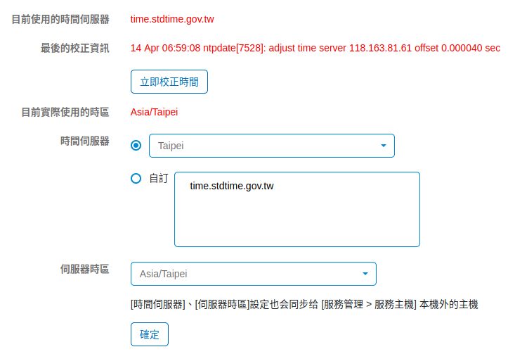 目前使用的時間伺服器:顯示系統目前使用的時間伺服器。最後的校正資訊:顯示伺服器跟時間伺服器最後更新的紀錄,由紀錄可以看出時間差多少或是校正是否成功。上圖中,顯示 14 Apr 12:59:08 ntpdate[17527]: adjust time server 118.163.81.61 offset 0.000040 sec 代表校正成功且有 0.000040 秒的差距。目前實際使用的時區: 顯示目前實際使用時區為何。時間伺服器:選擇一個符合當地時區的時間伺服器或是自行輸入一個時間伺服器的 Domain/IP 位址。例如:所在地區為台灣故選擇 Taipei 的時間伺服器。伺服器時區:選擇伺服器時區。「時間伺服器」、「伺服器時區」設定也會同步给「服務管理 > 服務主機」本機外的主機。