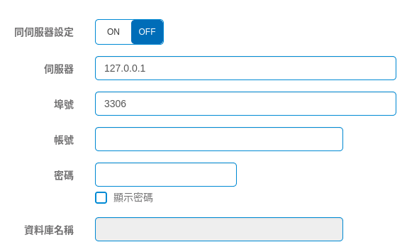 同主機設定: 參照基本設定內所屬的主機資料庫設定,若選擇 Off 則需輸入帳號密碼。