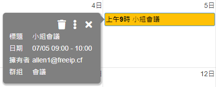 1. 在行事曆上點選您自行建立的活動事件後,即可刪除或在詳細選項「...」內進行編輯。![]()