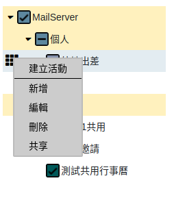 個人建立的行事曆群組預設為私人,而若是這個群組的活動事件與其他使用者有關,您可以設定是否與其他使用者共享這個行事曆。身為建立該行事曆的管理員,可以決定要和哪些人共享行事曆,也可以設定每個人的權限。設定共享的步驟與說明如下:1. 找到欲共享的行事曆群組前方編輯圖示,點選後選擇共享。![]()