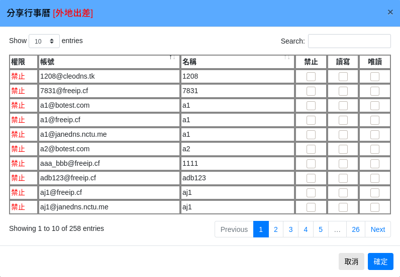 2. 點選後會進入分享行事曆視窗,這裡可以看到所有使用者帳號列表,選擇要分享的對象和設定權限。![]()